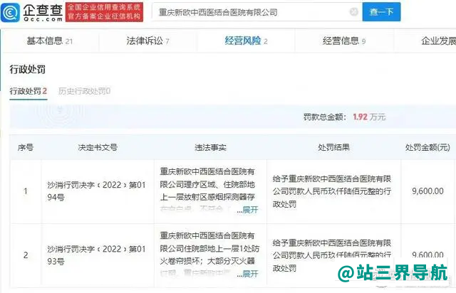 另据白鹿视频报道,企查APP显示,重庆新欧中西医结合医院有限公司成立于2017年,曾因理疗区域、住院部地上一层放射区感烟探测器存在空白点;住院部、门诊部楼梯间下设置房间,不符合有关规定;住院部地上一层1处防火卷帘损坏;大部分灭火器过期等,被罚1.92万元。